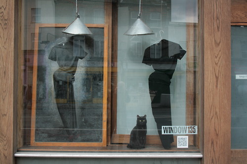 Currently the window is home to work by the shoe and jewellery designer Emily Botterman. Necklaces are draped from coat hangers – but they won’t be there for long. An enthusiastic Tim admits “after a week or so you become ready for something new.” Do they have a favourite window from over the years? Meena tells of placing “photographs of musicians’ heads in jam jars.” They smile. ”It’s about play.”