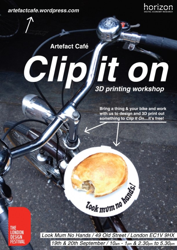 Next Wednesday and Thursday you’ll be able to pop along and get stuff printed via a Willy Wonka machine (also known as a 3D printer). The only condition is that the object you want to make somehow makes it easier to attach stuff to your bike. Thus the ‘Clip it On’ moniker. Genius, right?